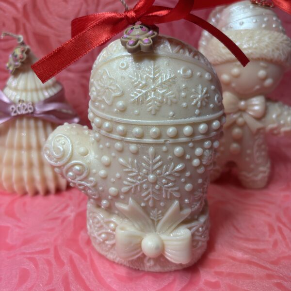 Χριστουγεννιάτικο δέντρο από φυτικό κερί σόγιας σε άρωμα μελομακάρονο και σχέδιο οριγκάμι. Στολισμένο με glitter,κορδελίτσα και μεταλλικό στοιχείο 2026. 270gr