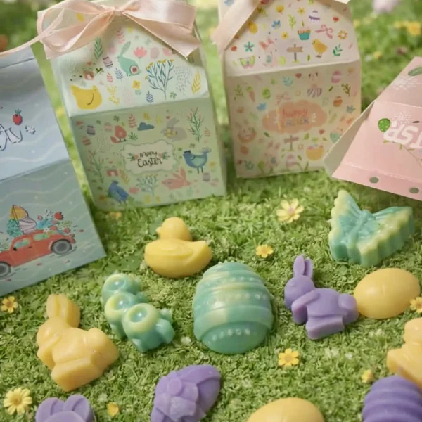 Πασχαλινό mystery box γεμάτο με χειροποίητα waxmelts και διακοσμητικά κεριά με φυτίλι από φυτικό κερί σόγιας! Το κουτί θα περιέχει εκτός από πασχαλινά και άλλα σχέδια και αρώματα.