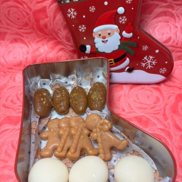 Χριστουγεννιάτικη μεταλλική συσκευασία σε σχήμα μπότας με χριστουγεννιάτικα waxmelts από φυτικό κερί ελαιολάδου σε σχήμα και άρωμα μελομακάρονο κουραμπιέ και gingerbread!