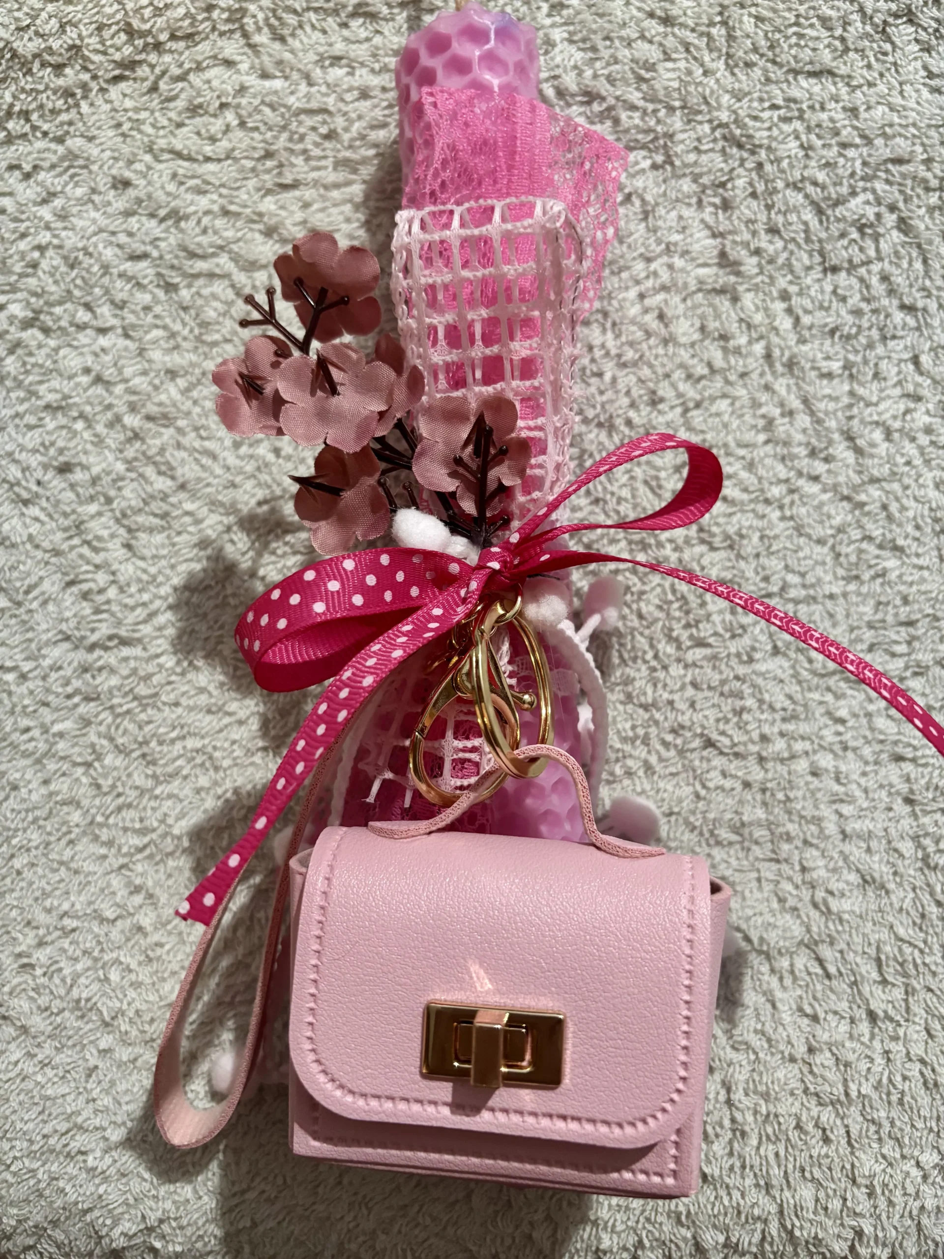 Λαμπάδα από φυτικό μελισσοκέρι σε ροζ χρώμα με ροζ τσαντάκι μπρελόκ!