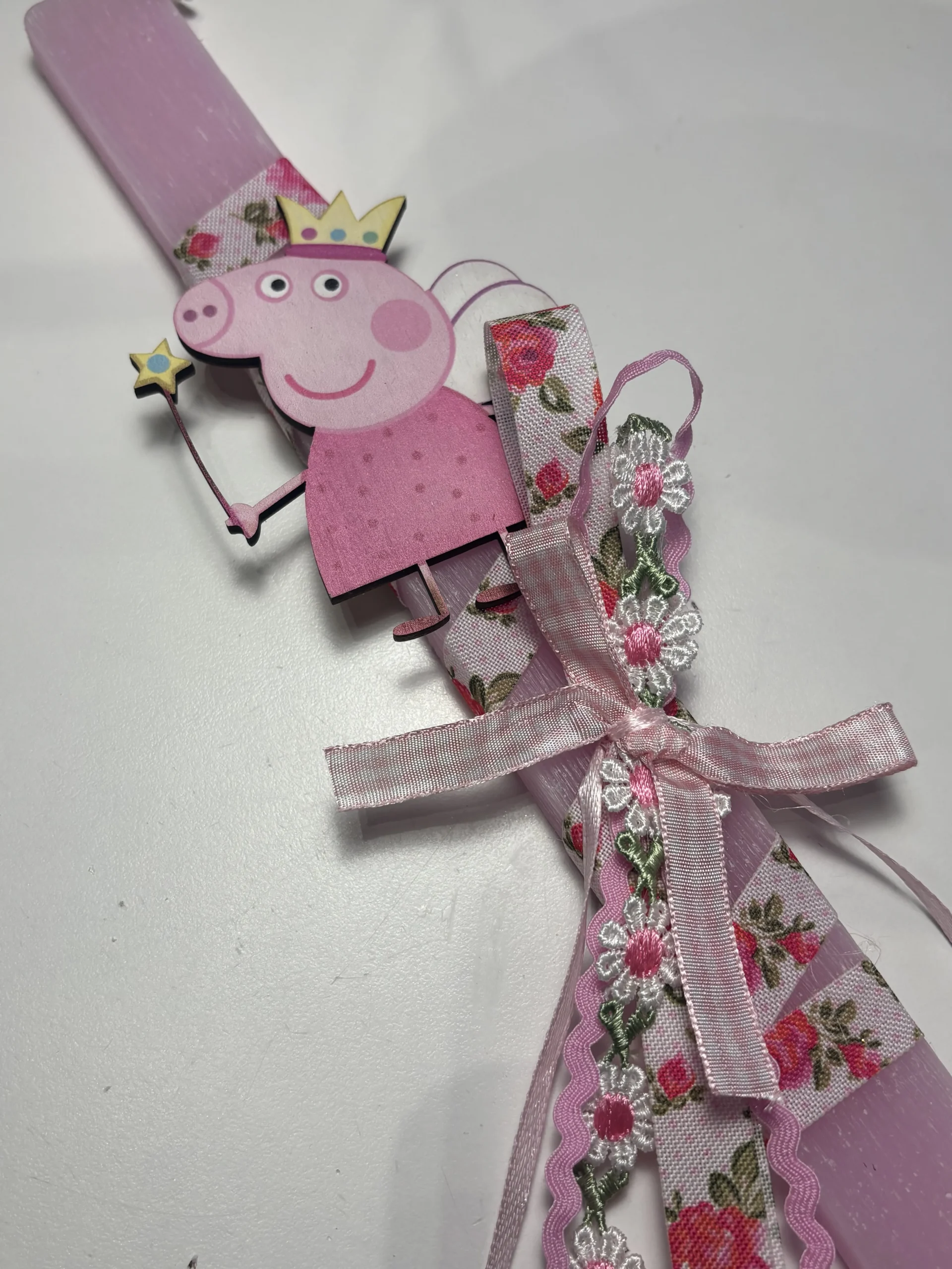 Λαμπάδα σε ροζ χρώμα διακοσμημένη με ομορφεσ κορδέλες και ξύλινο στοιχείο Πέπα!!