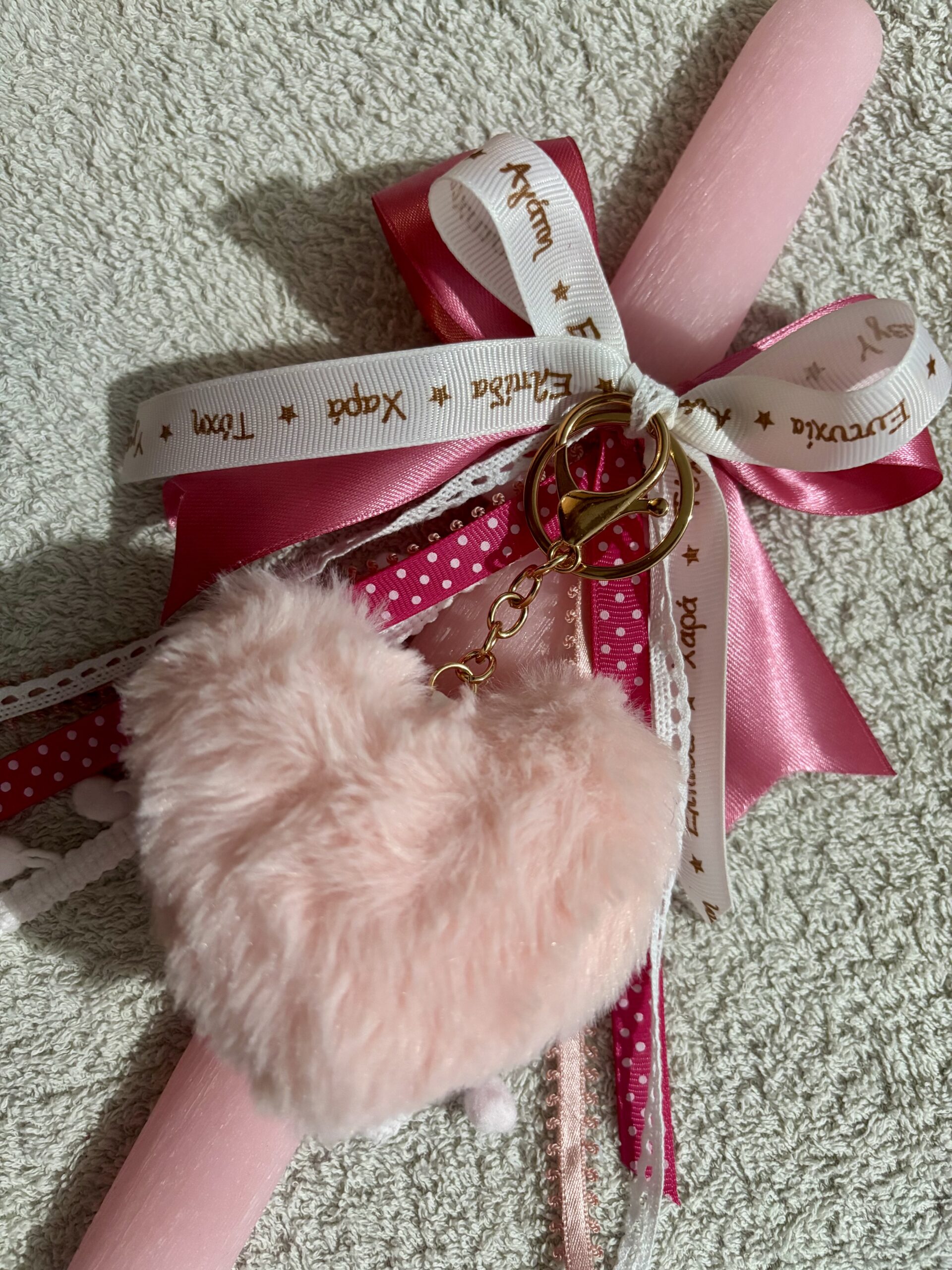 Λαμπάδα με μεγάλο μπρελόκ γούνινη καρδιά σε ροζ χρώμα!